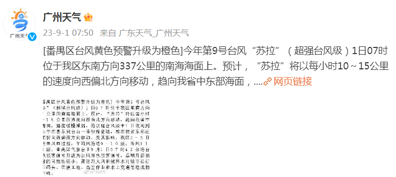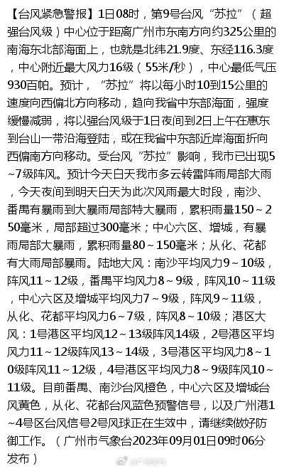 另外據市氣象臺監測,廣州市達到啟動氣象災害(臺風)Ⅲ級應急響應標準。市氣象災害應急指揮部決定從9月1日2時56分起將廣州市氣象災害(臺風)Ⅳ級應急響應升級為Ⅲ級應急響應。請按照預案規定做好防御工作。