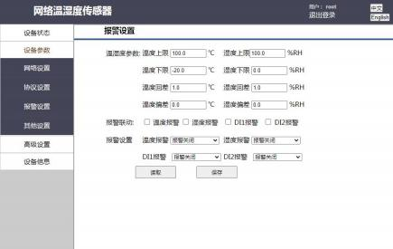 用戶在該頁面可以設置溫度、濕度上下限報警閾值、報警回差值,用戶可以自由選擇是否開啟報警以及報警觸發(fā)條件,同時在該頁面用戶可以選擇報警是否需要聯動繼電器,如果選擇聯動,那么報警觸發(fā)時,繼電器將會工作。