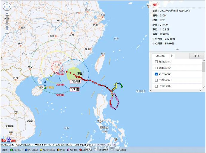 截至1日09時,“蘇拉”(超強臺風級)中心位于距離廣州市東南方向約315公里的南海東北部海面上,也就是北緯21.9度、東經116.2度,中心附近最大風力16級(55米/秒),中心最低氣壓930百帕。